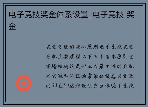 奖金分配的核心原则 电子竞技奖金分配主要遵循以下三个基本原则: ️ 金字塔结构:这是行业内最主流的分配方式,冠军队伍通常能独揽总奖金池的30%至50%**。这种做法充分体现了竞技体育优胜劣汰的本质,以高额回报激励顶尖选手不断突破极限。 阶梯式递减:为确保参赛队伍的积极性并维持生态健康,从八强到亚...